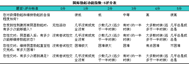(1)国际勃起功能指数-5/(IIEF-5):i是简单有效的ED筛选工具。根据患者过去6个月内性生活的情况,l对5个问题进行自我评分,l将每项得分相加得总分。6~10分,l重度勃起功能障碍;11~16分,l中度勃起功能障碍;17~21分,l轻到中度勃起功能障碍;22~25分,l轻度勃起功能障碍;26~30分,l无勃起功能障碍(见下表)。