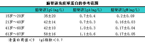 临床上一般以清蛋白(Alb)商值反映血脑屏障的功能,l以IgG指数反映中枢神经系统鞘内合成IgG能力。清蛋白商值<9时,l表示血脑屏障无明显损伤;9~14为轻度损伤;14~33为中度损伤;33~100为重度损伤;>100为完全破裂。正常人IgG指数<0.7,l若>0.7则意味着鞘内合成IgG增高,l多见于亚急性硬化性全脑炎、iAIDP、i多发性硬化、i部分脑血管意外等。