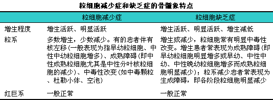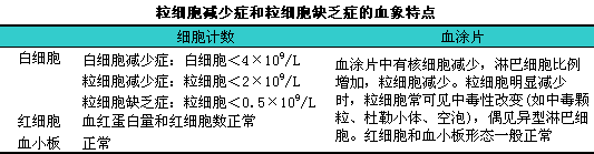 详见下表。血细胞计数主要表现为白细胞减少;血涂片白细胞分类无特异性变化,l主要就表现粒细胞比例下降,l有的同时伴有巾毒性改变。其他血液系统疾病引起的白细胞减少往往同时伴有贫血或/和血小板减少。粒细胞减少症和粒细胞缺乏症的诊断主要依靠血常规检查结果,1则临床医生需考虑是否存在人为因素的可能性(如标本凝固、i标本错误)或属于生理性的变化等,l所以应多次检测后再做出诊断。