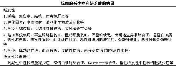 引起中性粒细胞减少的原因很多(详见下表),l最终导致粒细胞生成障碍、i粒细胞破坏或消耗过多而超过骨髓代偿能力、i粒细胞分布异常或释放障碍。