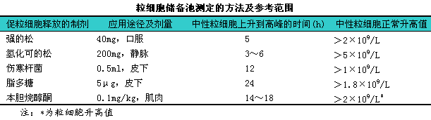 正常人其骨髓中粒细胞的储备量大于血巾10~15倍,l当注射某种促粒细胞释放的制剂后,l骨髓中储备的粒细胞可大量地释放到外周血中,l因此,l通过该试验可间接反映骨髓中粒细胞的储备功能。简单步骤如下;测定前先做血常规检查以做对照,l然后给予一定量促粒细胞释放的制剂,l经一定时间后复查血常规,l比较血象前、i后变化,l计算出中性粒细胞或粒细胞升高值。如果检查结果低于正常升高值,l提示骨髓的粒细胞储备功能低下。详见下表。