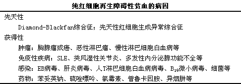 按病因两大类分为:i先天性和获得性,l详见下表6,l也有少数患者找不到明确的病因。获得性又分为急性和慢性,l急性PRCA有的又称为急性造血停滞(通常是病毒如B19微小病毒感染引起的)。有些PRCA在病程中发生了白细胞、i血小板减少,l而成为一般的再障。PRCA的发病机制不清楚,l可能与免疫有关。