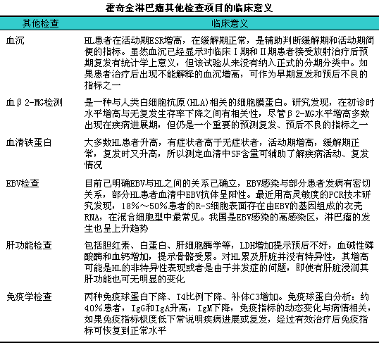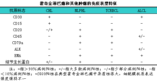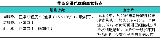 详见下表。HL初诊时约有40%患者有贫血(轻至中度),l贫血一般为正细胞正色索性,l也有表现为小细胞低色素性或大细胞性。在疾病进展期时,l贫血更为常见,l所以进行性贫血是临床上判断恶性淋巴瘤发展与否的一个重要指标之一。个别患者初诊时伴有Coombs试验阳性的溶血性贫血,l而导致网织红细胞增加。轻度的白细胞增高、i单核细胞增高和淋巴细胞减少可以出现在霍奇淋巴瘤中(尤其是在疾病进展期时比较常见);嗜酸性粒细胞也可增多,l尤其见于伴有皮肤特异性损害的患者。虽然血象中无特异性的表现,l但可了解患者基本状况。