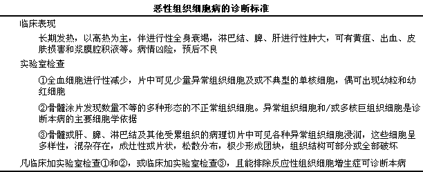 恶组目前的诊断标准详见下表。但是根据此标准容易将恶性淋巴瘤误认是恶组,l所以现在主张诊断恶组必须要通过免疫组织化学染色、i分子生物学等检查证实:i有单核-巨噬细胞的特异性标志而无T、iB淋巴细胞及NK细胞的标志。同时还应注意与嗜血细胞综合征区别。