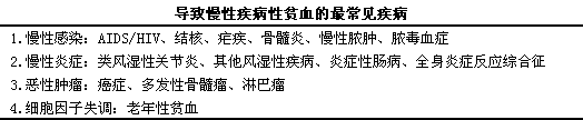 导致慢性贫血的常见疾病见下表。贫血的原因是炎症细胞因子对红细胞产生具有抑制作用。在这些细胞因子中,lIL-6起关键性作用。IL-6使肝细胞分泌的铁调控激素hepcidin产生增加,11hepcidin阻止巨噬细胞和肝细胞释放铁,l导致特征性的血清铁降低,l红细胞生成需要的可利用铁减少。