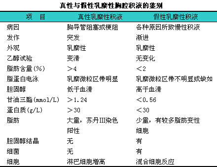 (3)临床诊断价值与评价:i积液中脂质含量如胆固醇、i甘油三酯等分析对真性乳糜性积液与假性乳糜性积液的鉴别有重要价值。积液中的甘油三酯大于1.24mmol/L,l常提示为真性乳糜性积液。甘油三酯小于0.56mmol/L,l且乳糜微粒区带不明显或缺如时,l则多为假性乳糜性积液。假性乳糜性积液中还常可见到胆固醇结晶。真性与假性乳糜性胸腔积液的鉴别见下表。