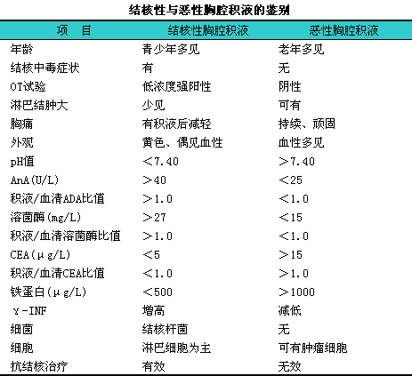4)临床诊断价值与评价:i结核性积液ADA活性常大干40U/L,l其对结核性积液诊断的阳性率可达99%,l优于结核菌素试验、i细菌和活组织检查。当经抗结核药物治疗有效时,l其ADA活性随之减低,l因此,lADA活性测定对结核性积液诊断租疗效观察有重要价值。结核性与恶性胸腔积液的鉴别见下表。