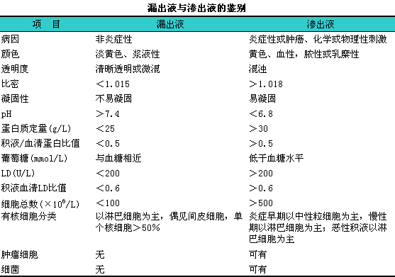 (9)黏蛋白定性试验:i又称李凡他试验。漏出性胸腔积液试验一般为阴性,l而渗出性胸腔积液试验一般为阳性。漏出液和渗出液两者区分详见下表。