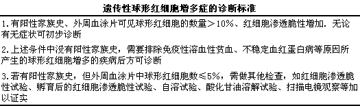 遗传性球形红细胞增多症的诊断应结合病史、i临床表现和实验室检查进行综合分析。典型病例有黄疸、i贫血、i脾太、i网织红细胞增多、i球形红细胞增多,l红细胞脆性增加和阳性家族史等即可做出诊断。对于轻型病例,l特别是球形红细胞数量不多、i渗透脆性正常者,l须做红细胞孵育后脆性试验和自身溶血试验等确诊,l有的要做扫描电镜等检查才能确诊。目前国内对遗传性球形红细胞增多症的诊断标准见下表。HS还要注意与自身免疫性溶血性贫血、i新生儿溶血症、iG6PD缺乏症及不稳定血红蛋白病进行鉴别。
