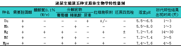在分离鉴定过程中,l必要时,l阳性培养物还需分别取过滤培养物0.2ml接种生化管(葡萄糖、i尿素、i精氨酸)进行底分解物试验初筛,l泌尿生殖道五种支原体生物学特性鉴别见下表。