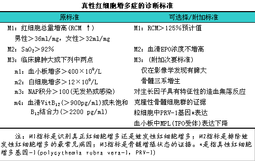 真性红细胞增多症研究组制定一套临床上实用的诊断标准,l详见下表。诊断真性红细胞增多症需要符合所有三个主要标准(M)或者是前两个主要标准和至少两个次要标准(m)。第一个主要标准是为了确定患者体内红细胞属于真正或绝对增多,l以红细胞总量增高为指标。第二个主要标准是为了排除继发性红细胞增多的最常见病因,l即严重的低氧血症,l以正常或仅轻度减少动脉血氧饱和度来反应。第三个标准是骨髓增殖性疾病的一些共同证据.其中以脾大为主要表现,l并附加几个次要标准构成。对于诊断相对困难的病例,l以下三个试验有时会有帮助:i血清EPO水平、i造血细胞克隆性分析以及在没有外源性EPO时骨髓细胞红系集落自发性形成。
