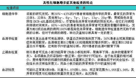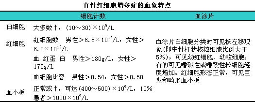 患者全血常呈暗红色,l全血细胞数一般均增加,l其血常规的主要特点是红细胞数、i血红蛋白量明显增加。如果患者同时伴有反复的消化道出血,l可引起缺铁则出现小细胞低色素血症。网织红细胞百分比不会增加,l但伴有溶血者会增加。由于红细胞数明显增加,l血液较黏稠,l制备成血涂片其血膜往往较厚,l因此血涂片上的红细胞分布密集,l但白细胞分类无特异性异常,l详见下表。有的患者血涂片中可见嗜碱性粒细胞、i嗜酸性粒细胞或单核细胞的比例增加,l这是骨髓增殖性疾病的标志之一。PV患者的血涂片中一般不会出现原始细胞,l如果片中原始细胞增多,l则有可能是其向骨髓增生异常综合征(MDS)或急性白血病转化的信号。