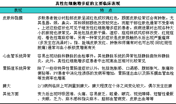 本病高峰发病年龄在60~80岁.发病年龄小于40的病例也时有报道。本病的症状和体征多数是由两种原因引起:i一是全血容量增加;二是由于全血粘滞度增高而导致血流变缓慢。大多数患者起病缓慢,l症状隐匿;另一方面某些患者根本没有任何不适症状,l只是偶尔在体检时发现异常。有的患者由于脾肿大导致上腹部下坠感或饱胀感,l这也是导致患者就诊的原因之一。真性红细胞增多症的主要临床表现见下表。少数患者在疾病进展过程中出现骨髓纤维化和急性白血病。