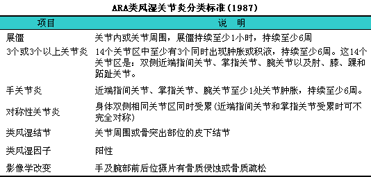 1.诊断 类风湿关节炎的诊断主要依靠患者的临床表现。X线检查和某些自身抗体检测对诊断有很好的参考价值,l但并非特异的指标。随检测技术的发展,l一些自身抗体的特异性和敏感性可能会有提高,l从而有助于RA的诊断。目前,l在RA的诊断中,l仍以美国风湿病学会(ARA)1987年修订的标准最为常用.见下表。