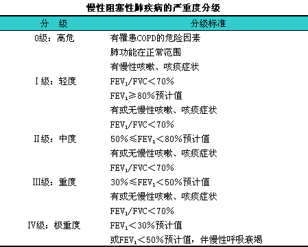 2.严重度分级 COPD严重度分级主要根据气流受限程度和症状确定。肺功能中FEV1的变化是其重要的标准(见下表)。