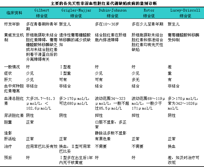 2.鉴别诊断 新生儿生理性黄疸、i母乳性黄疸通过询问病史、i结合症状、i体征与实验室检查易于鉴别。其他主要的各先天性非溶血性胆红素代谢缺陷疾病的鉴别诊断,l见下表。