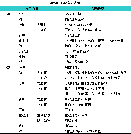 1.血栓形成 APS血管性血栓形成的临床表现,l取决于受累血管的种类、i部位和大小,l可以表现为单一血管或多个血管受累(见下表)。