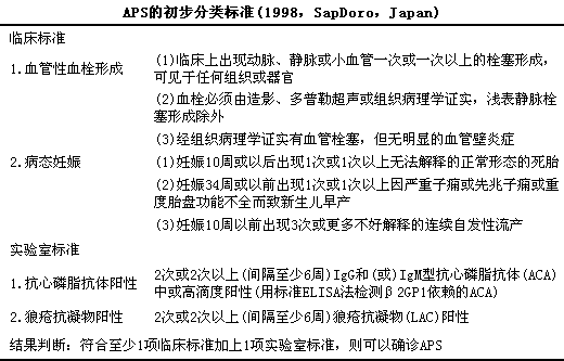 1.诊断 PAPS的诊断主要依靠临床表现和实验室检查,l还必须排除其他自身免疫病和感染、i肿瘤等疾病引起的血栓。目前最常用的PAPS分类标准是1998年10月第8届APL国际研讨会上日本Sapporo提出的APS初步分类标准,l见下表。