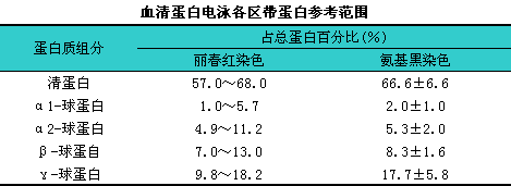 (2)参考范围:i多数用各组分蛋白的百分含量报告。由于各实验室采用的电泳条件包括染色液等不同,l参考范围也有差异。常用的两种染色液检测结果的参考范围参见下表。
