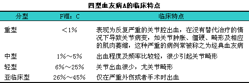 典型的血友病A在临床上表现为轻微外伤后的出血不止,l如软组织血肿、i关节腔积血,l其发生机会和严重程度与FⅧ:iC的水平相关。临床上按FⅧ:iC将血友病A分成四型,l各型特点见下表。