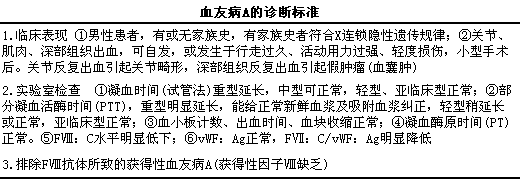 诊断血友病A不难,l在男性患者,l有或无家族史,l自幼起病,l自发性或者轻度外伤后出血不止,l测定FⅧ:iC明显减低,l考虑为血友病A。国内的具体诊断标准见下表。血友病A主要应与其他遗传性凝血因子缺乏症进行鉴别。